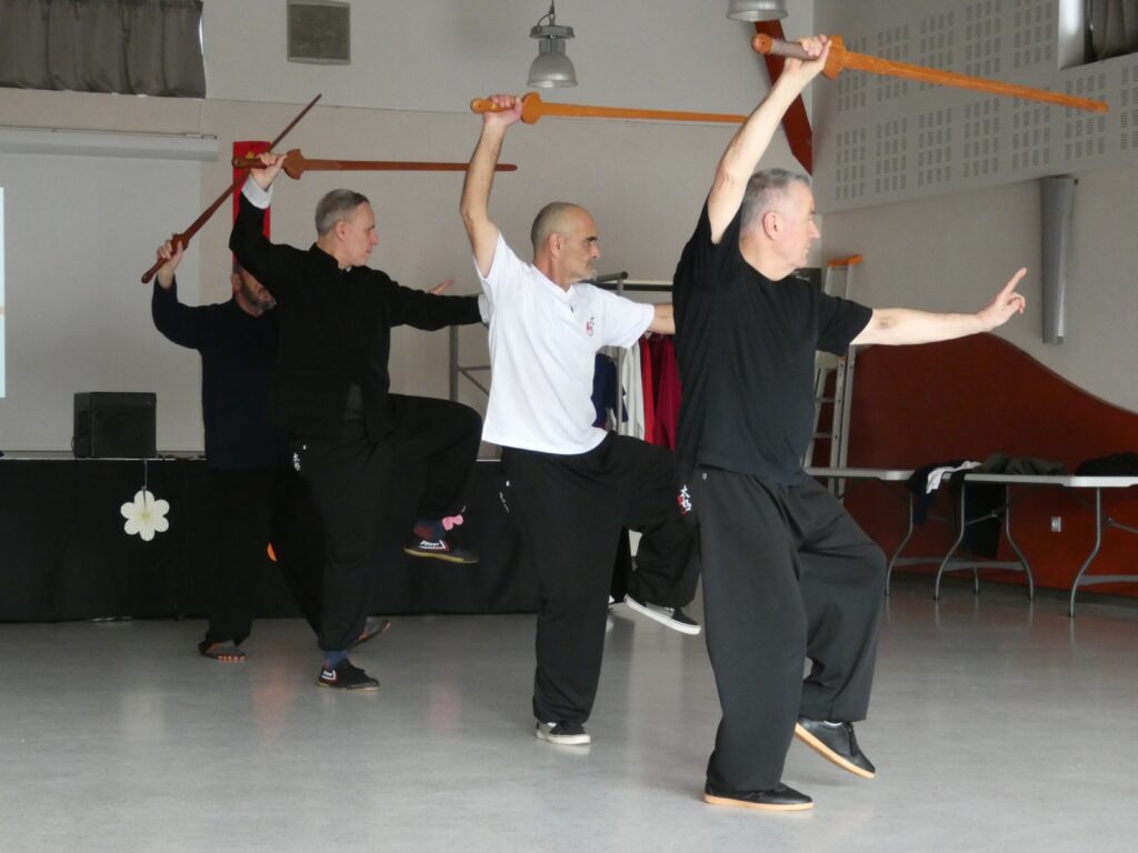 Ainsi, nous avons pu présenter la 1ère partie de la forme à mains nues, une restitution des 1ères séances d’apprentissage de la forme de l’épée, de la forme du bâton et, pour finir, la démonstration de la 3ème section de la forme à mains nues.