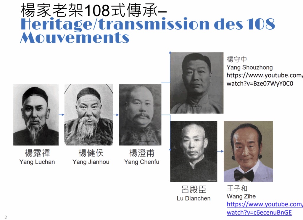 2- Les caractéristiques traditionnelles du Taijiquan sont préservées en considérant la référence d’origine à楊澄甫Yángchéngfǔ , la référence comme norme à la vidéo de 楊守中Yáng shǒuzhōng et les 108 mouvements de 王子和Wáng zǐhé comme style spirituel d’affiliation.